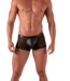 Deze zwembroek is vervaardigd uit een stof met dubbele textuur: een verleidelijke mix van lichte mesh en zwart imitatieleer die zich vormt als een tweede huid rond je lichaam.